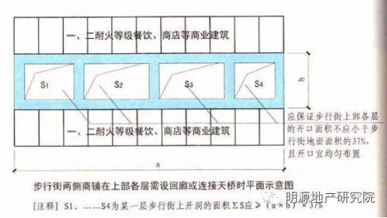 6.步行街兩側(cè)的商鋪在上部各層需設(shè)置回廊和連接天橋時(shí),應(yīng)保證步行街上部各層樓板的開(kāi)口面積不應(yīng)小于步行街地面面積的37%,且開(kāi)口宜均勻布置;