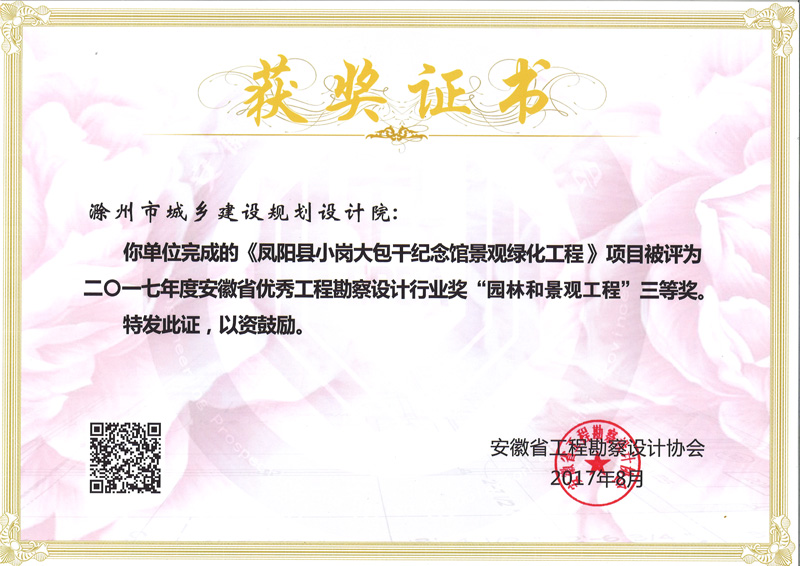 鳳陽(yáng)縣小崗大包干紀(jì)念館景觀綠化工程獲獎(jiǎng)證書