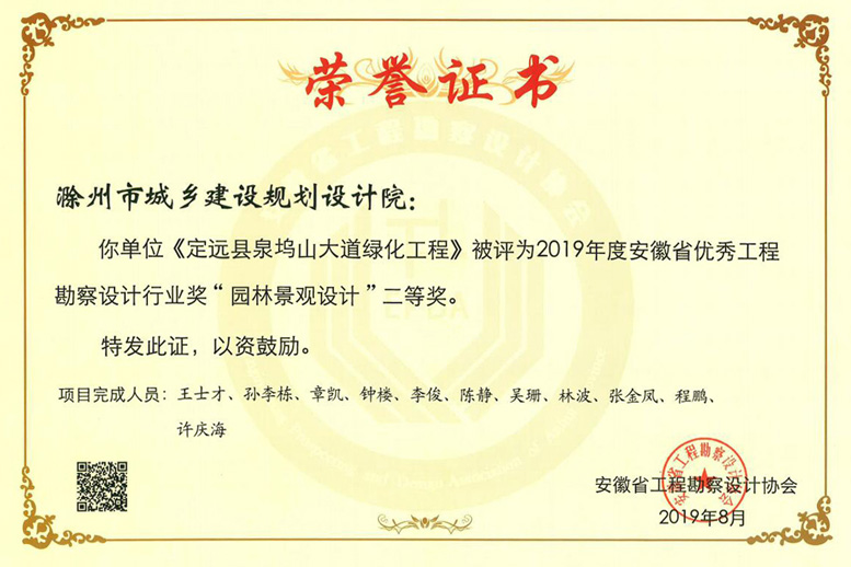 滁州市瑯琊古道綜合整治工程獲獎(jiǎng)證書.